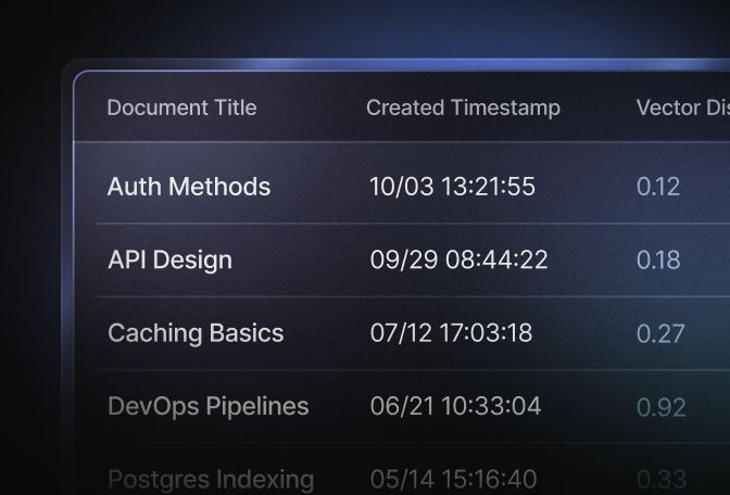 Combine vector search, full-text search, relational data, and SQL analytics in a single system. No glue code between databases.